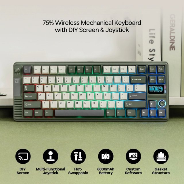 Enjoy a fluid typing experience powered by a long-lasting 8000mAh battery, hot-swappable switches, and tri-mode connectivity. The 1.47-inch TFT screen lets you display custom GIFs and useful system info, while the joystick gives you effortless control over volume and lighting without breaking your flow. Its ergonomic typing angles and Cherry-profile keycaps keep your hands relaxed, making it ideal for long work sessions, extended gaming nights, or everyday multitasking.